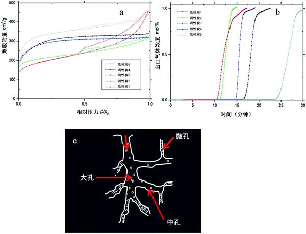 圖2:(a)氮吸附等溫線(xiàn),(b)活性炭樣品的C 3 H 8吸附結(jié)果,(c)吸附在活性炭中的氣體的卡通圖像。
