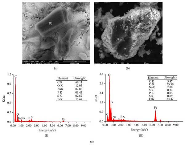 用掃描電子顯微鏡(SEM)對活性炭的形態(tài)研究顯示了具有不均勻的顆粒的均勻相尺寸大于20 μM(圖2(a))。顯微照片與未經(jīng)改性活性炭進(jìn)行的SEM研究一致。在合成載體的情況下,可以看出活性炭被較小尺寸的相覆蓋(圖2(b))。用能量色散光譜證實(shí)了這一點(diǎn)(圖2(c)),顯示了(I)部分的活性炭含量較大,而區(qū)域(II)的Fe含量較高,因此得出的結(jié)論是磁鐵礦相覆蓋活性炭。