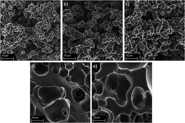 通過掃描電子顯微鏡對高比表面積活性炭進行表征于圖2a-c中?梢钥闯龅氖沁@幾種活性炭具有它是由球形碳顆粒的尺寸與周圍3μm的孔隙網(wǎng)絡結構,這是典型的基于甲醛樹脂活性炭。球形活性炭納米顆粒的燒結導致孔隙網(wǎng)絡內(nèi)的空腔,其在直徑為2至20μm的形成。活性炭表面是光滑的,沒有燒結的球形活性炭納米顆粒,而它們?nèi)匀辉诰W(wǎng)絡內(nèi)具有相似直徑的空腔。由于在化學活化之前低的預碳化溫度,球形納米顆粒在活化過程中強烈聚集,這導致如前所述的較不剛性的孔隙網(wǎng)絡。