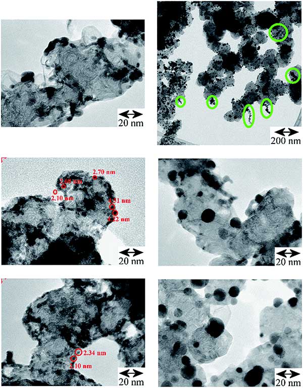 活性炭負載鈀催化劑的TEM比較顯示在圖1。左:原始活性炭,右頂部和中部:在300°C和底部:400°C下進行碳熱處理后,這會導(dǎo)致活性炭的顆粒增長,但之后聚集體大部分缺失孤立的較大平均尺寸增大的鈀微晶留在活性炭表面。右上:在300℃處理后的活性炭負載鈀的調(diào)查圖像,其中的橢圓形綠色標(biāo)記突出顯示在400℃催化劑上不存在的殘余聚集體。顯示貴金屬實體的形狀,尺寸和形態(tài)之間的明顯差異。對于活性炭負載鈀,在多孔高表面積活性炭載體上/中存在大部分分離的初級顆粒。對于活性炭催化劑,主要存在線性聚集鏈和支化聚集體,在表面具有一些聚集體。熱處理導(dǎo)致大部分分離的初級顆粒尺寸增大,僅剩下少量聚集體或附聚物。