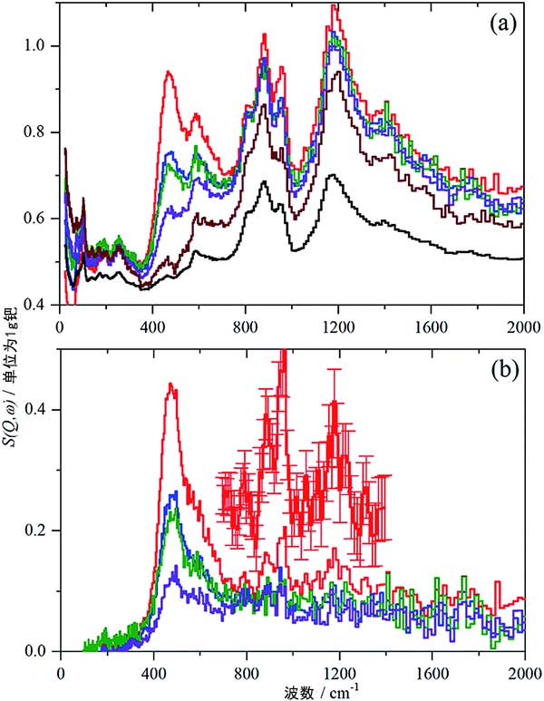 對于活性炭樣品中的每一個,氫氣在飽和壓力(700毫巴)下記錄IINS光譜,然后逐漸使每個活性炭脫氫,首先使其在室溫下脫氣不同時間并且然后在200°C下放置12小時。圖2顯示了標(biāo)準化光譜活性炭和活性炭負載鈀的差異光譜,(a)記錄的標(biāo)準化光譜,氫氣從上到下在700毫巴下,抽真空至9毫巴,抽空至3毫巴,在200℃下抽真空放置12小時,在200℃下第二次抽真空后放置12小時的活性炭。(b)減去在200℃下第二次抽空過夜的樣品后的差異光譜,從上到下:氫氣在700毫巴下,抽真空至9毫巴,抽真空至3毫巴,在200℃抽真空放置12小時后的活性炭負載鈀催化劑。