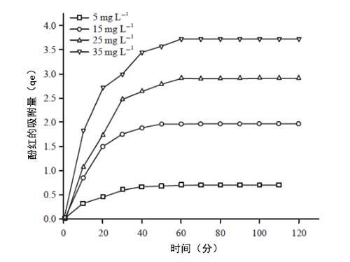 影響酚紅初始濃度的影響:q e(每克吸附劑吸附的酚紅量)(mg g-1)與接觸時間(min)的關(guān)系,使用不同的初始濃度(5-35mg)在給定的吸附劑量(5g L-1)和pH(2.0)下,L-1的酚紅顯示在圖3中。由于吸附-解吸平衡,每個圖表顯示吸附隨接觸時間的初始增加,然后在特征接觸時間達(dá)到飽和,表明在研究活性炭上酚紅的單層覆蓋。吸附的染料量和達(dá)到吸附平衡所需的時間隨著底物(染料)初始濃度的增加而增加。很明顯,因?yàn)樵谳^高的染料初始濃度下,活性炭表面上相互作用的吸附分子的數(shù)量變得更高。