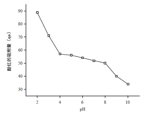 pH對吸附的影響:由于氫和氫氧根離子通常在活性炭表面上非常強(qiáng)烈地吸附,因此其他離子的吸附也受到溶液pH的影響。pH也影響染料的離子化程度以及吸附劑的表面性質(zhì)。作為pH的函數(shù)的活性炭中酚紅染料的百分比吸附的圖示于圖4中。觀察到(a)染料的吸附在2至4的范圍內(nèi)迅速降低。(b)在4-8的pH范圍內(nèi)吸附的減少變慢,和(c)在pH8-10的吸附下急劇下降。在研究的活性炭上染料吸附的這種獨(dú)特的pH依賴性變化可能是由于吸附物的復(fù)雜性質(zhì)以及吸附劑在不同介質(zhì)pH下的凈電荷變化。