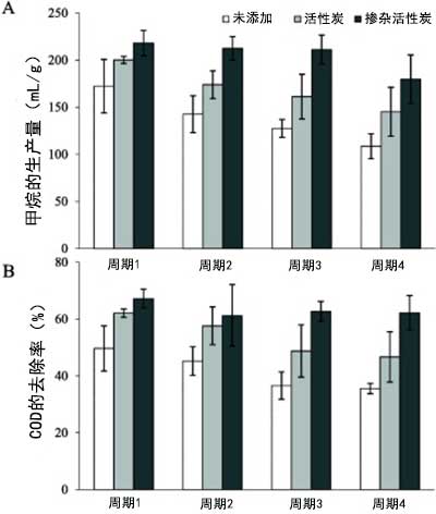 圖2:(A)四個連續(xù)活性炭補料分批循環(huán)中的平均特定甲烷產(chǎn)量和(B)COD去除效率。