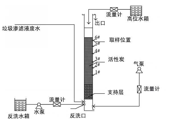 活性炭反應(yīng)器工藝流程圖如圖1所示。活性炭池由有機(jī)玻璃制成,有機(jī)玻璃是柱式反應(yīng)器;钚蕴砍馗叨葹2米。內(nèi)徑為63毫米。填充高度為1800毫米。碳層高度為1500毫米。砂濾器高度為300毫米。反應(yīng)體積為4.7 L.有5個(gè)水取樣口和碳池。底部有曝氣器,碳池頂部有溢流堰。水質(zhì)分析指標(biāo)為紫外分光光度法和紫外分光光度計(jì)。