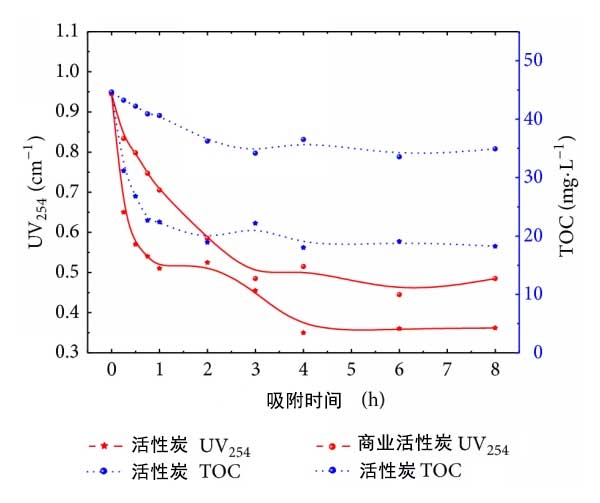 根據(jù)圖4,活性炭表現(xiàn)出良好的吸附生化水的性質(zhì)。UV254和TOC的濃度具有類(lèi)似的變化趨勢(shì)。UV254和TOC的去除效率分別為63.0%和59.7%。商業(yè)活性炭的吸附性能較弱。UV254和TOC的去除率僅為52.9%和24.8%。商業(yè)活性炭的孔體積小于活性炭的孔體積。圖4中活性炭的UV254去除曲線分為兩個(gè)階段,它們分別對(duì)應(yīng)于膜擴(kuò)散和粒子擴(kuò)散。
