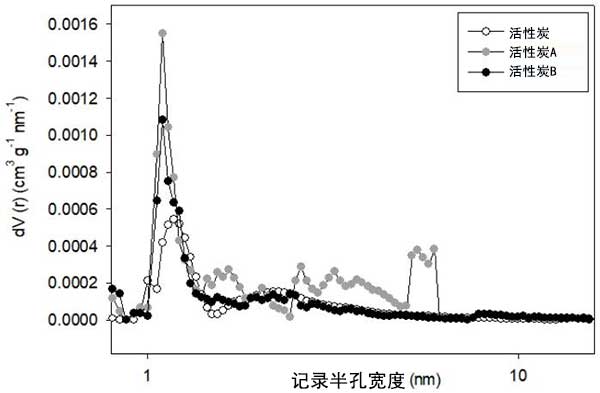 可以觀察到,由于在解吸分支中形成的小磁滯回線,活性炭普遍具有微孔性,這表明毛細(xì)孔凝結(jié)很小,因此中孔的量較少。通過QSDFT方法獲得這幾種活性炭的總體積和孔徑分布,假設(shè)孔為狹縫圓柱形。圖2顯示了三種研究的活性炭的孔徑分布,可以確認(rèn),對(duì)于所有活性炭樣品,主要存在于1.0-1.5nm區(qū)域的微孔,而對(duì)于活性炭A,也可以檢測(cè)到少量的中孔。