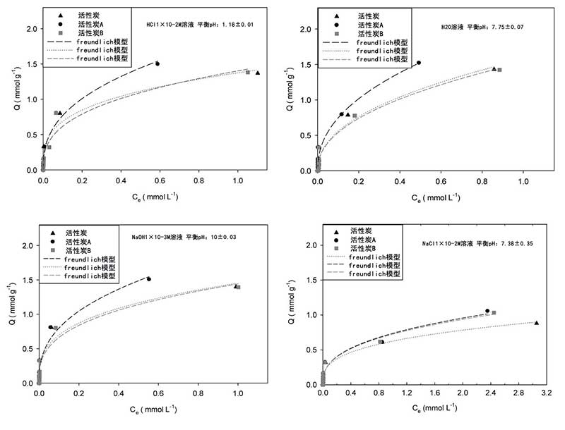 圖3:分別顯示了在不同溶液中三種活性炭在20℃下對(duì)羥基苯甲酸甲酯的吸附等溫線。