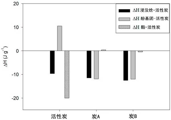 為了確定酯基在吸附質(zhì)-吸附劑相互作用中的貢獻(xiàn),從對(duì)羥基苯甲酸甲酯-活性炭和苯酚-活性炭的相互作用焓開始計(jì)算相互作用的焓酯-活性炭。對(duì)于該計(jì)算,假設(shè)焓是分子的加成組成性質(zhì),因此對(duì)羥基苯甲酸甲酯-活性炭的相互作用焓對(duì)應(yīng)于苯酚和酯與活性炭相互作用焓的總和。圖4中顯示了對(duì)羥基苯甲酸甲酯-活性炭,苯酚-活性炭和酯基團(tuán)在水中吸附物-吸附劑的相互作用中的貢獻(xiàn)。