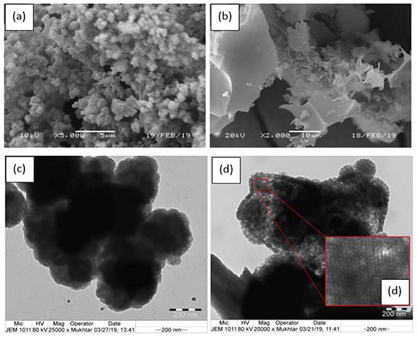 使用SEM,TEM,TGA和XRD分析活性炭的表面形態(tài),熱性質和結晶度。用作活性炭前體的圖像(圖1a,c)顯示其典型的形態(tài)為花椰菜樣結構,這種形態(tài)似乎是由于與其中摻雜地嵌入無序聚合鏈形成的。然而,聚吡咯的球形結構通過碳化過程被破壞,導致粗糙,粗糙的表面由不規(guī)則的尖角和剝離狀顆粒組成,在SEM圖像中幾乎沒有孔隙的跡象;钚蕴烤圻量┑腡EM圖像如圖1d所示表示觀察到均勻分布的微孔。此外,TEM圖像描繪了高度豐富和對稱的孔隙,表面積和微孔率的值對應于該活性炭。發(fā)現(xiàn)隨著活化劑用量的增加,表面積增加,孔隙率增加。