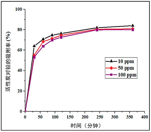 圖2:在三種不同濃度下,活性炭對鉛離子的吸附百分比與時間的關系。