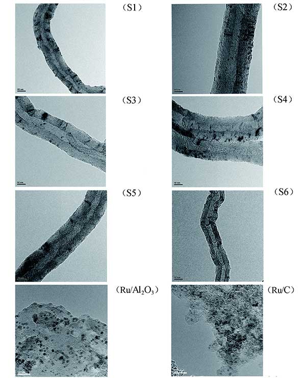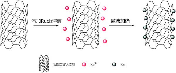 所有載釕活性炭上的釕負(fù)載量理論上為5%。通常,將活性炭加入120mL乙二醇中。并將混合物在超聲處理30分鐘以確;钚蕴烤鶆蚍稚。超聲處理后,在連續(xù)攪拌下滴加3.0mL RuCl 3水溶液30分鐘。然后是使用NaOH乙二醇溶液將混合物的pH調(diào)節(jié)至4.0。然后,在連續(xù)攪拌24小時(shí)后,將溶液放入微波合成反應(yīng)器中加熱100秒。過濾混合物溶液,用去離子水洗滌直至濾液的pH達(dá)到7.0,并在80℃下真空干燥。將樣品研磨成粉末使用。由于活性炭的表面是疏水的,它們傾向于在極性溶劑中聚集。并且由官能團(tuán)改性的活性炭可以提供足夠的孔隙以使釕納米顆粒均勻地分布在活性炭的表面上。在通過微波加熱的多元醇方法制備活性炭負(fù)載的釕納米顆粒。合成過程如圖1所示。