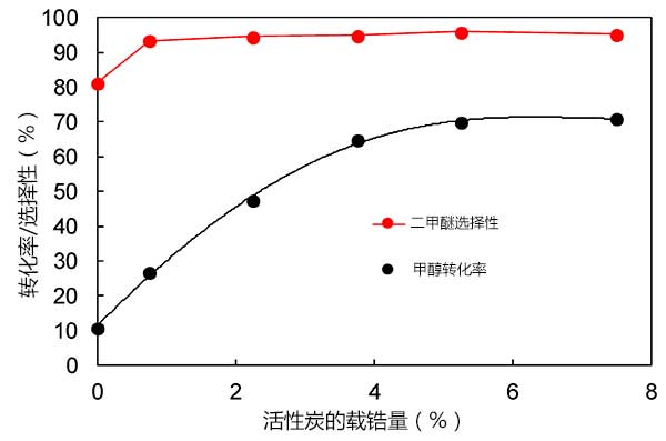 圖2:穩(wěn)態(tài)甲醇轉化率和對二甲醚的選擇性活性炭的鋯負載的變化。