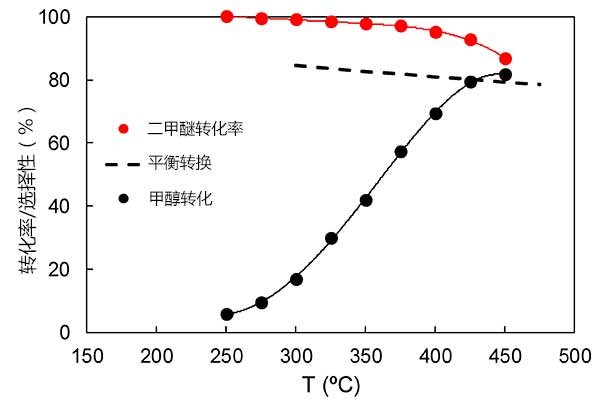 圖3:溫度變化對甲醇轉化率和二甲醚的選擇性影響。