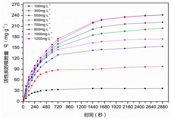 初始鉻黑T濃度對活性炭吸附的影響:用一系列鉻黑T水溶液(濃度:100.0-1200.0mg·L-1,體積:50mL)進行初始鉻黑T濃度效應實驗。將溶液的pH調節(jié)至合適,然后將溶液加入3.00g·L-1活性炭中,并將混合物在25℃的溫度下在振蕩器上平衡48小時,定期取水樣,測量鉻黑T水溶液的濃度,并計算吸附的鉻黑T量。