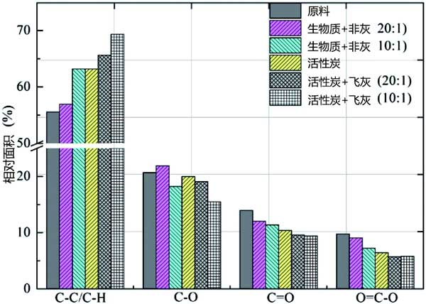 表面基團(tuán)的芳香族C-C或C-H隨著活性炭原料在熱解時的比例增加以及氣體活化而增加可以從圖2中可以看出。這是預(yù)期的,在不完全燃燒和部分氧化可導(dǎo)致在含碳材料內(nèi)形成芳族化合物。含氧官能團(tuán)如C-O,C=O和O.=隨著生物炭和活性炭的煤飛灰比例增加,C-O的相對面積減小。煤飛灰似乎提高了芳構(gòu)化程度,但顯著降低了羰基的相對濃度,同時保持或適度降低了酮和羧酸的性質(zhì)。這可能涉及先前發(fā)現(xiàn)的用于生物質(zhì)和煤飛灰的共熱解的生物燃料的增強(qiáng)的脫氧,并且表明活性炭的表面化學(xué)可以使用煤飛灰作為添加劑來介導(dǎo)。