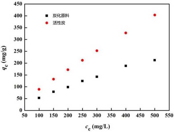 吸附等溫線:吸附等溫線對于描述溶質如何與吸附劑相互作用非常重要,并且對于優(yōu)化吸附劑的使用至關重要。Langmuir等溫線假定單層吸附在含有均勻策略和吸附的有限數(shù)量的吸附位點的表面上,而在表面平面內(nèi)沒有吸附物的遷移。圖4顯示了柴油在所制備活性炭上的平衡吸附等溫線。從圖中可以看出,與炭化原料相比,活性炭的吸附等溫線更接近直線。隨著柴油溶液濃度的增加,活性炭對柴油溶液的吸附能力不斷增加。當柴油濃度為500 mg/L時,活性炭達到最大吸附量。然而,當柴油溶液濃度達到400 mg/L時,炭化原料的吸附容量增加緩慢。可能是柴油顆粒覆蓋了材料的表面,導致吸附速率降低。從圖4中可以清楚地看出,活性炭的吸附能力明顯強于炭化原料。