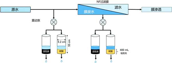 使用的納濾膜是螺旋纏繞膜。處理系列由30μm聚丙烯過濾器,帶防垢劑注入的給水泵和兩個(gè)串聯(lián)的NF膜組成。給水流量以78%的滲透物回收率為目標(biāo)。由于來自輸送管道的錳顆粒導(dǎo)致預(yù)濾器的部分堵塞導(dǎo)致需要更換過濾器七次,這導(dǎo)致進(jìn)料壓力略低,并且滲透物中全氟烷基物質(zhì)的濃度略高于平均值。原水是城市的地下水,這是一個(gè)受全氟烷基物質(zhì)污染的地下水井場(chǎng)。每周一次采集原水,滲透水和廢水的樣品,為期35周。使用活性炭和陰離子交換樹脂吸附柱進(jìn)一步處理原水和廢水(圖1)。