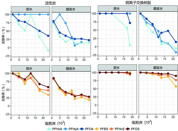 實(shí)驗(yàn)總計(jì)進(jìn)行了12周,每?jī)芍苋。這導(dǎo)致所有活性炭色譜柱的實(shí)驗(yàn)運(yùn)行時(shí)間為24個(gè),分別處理原水和膜廢水的陰離子交換樹脂色譜柱。在每次采樣之后每周對(duì)所有柱進(jìn)行反洗,以模擬典型的全尺寸操作?偣卜治隽15種全氟烷基物質(zhì),將吸附材料相對(duì)于全氟烷基物質(zhì)去除的性能與柱吸附模型的性能進(jìn)行了比較。