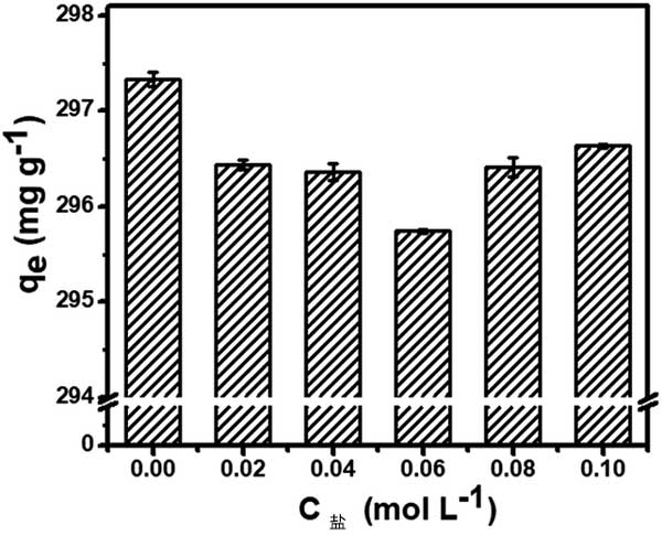 染料廢水含有各種鹽類和金屬離子,影響活性炭的吸附效率。在圖2中可以觀察到孔雀石綠對(duì)活性炭的吸附能力受鹽濃度的顯著影響。當(dāng)NaCl濃度為0.02mol L-1時(shí),吸附容量意外降低。然而,在將鹽濃度增加到0.10mol L-1的同時(shí),這種負(fù)面影響將變得可以忽略不計(jì)。如上所述,靜電相互作用可能在吸附過程中起關(guān)鍵作用。