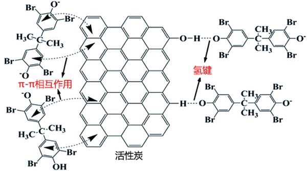 根據(jù)先前研究的多種吸附動力,包括靜電相互作用,氫鍵,π-π相互作用,疏水效應(yīng)等;谶@些結(jié)果,進一步提出了四溴雙酚A在活性炭表面上的可能吸附過程(圖4)。由此可以推斷,由于苯環(huán)和活性炭表面上的-OH基團,π-π相互作用可能在吸附過程中起重要作用,因為給電子官能團可能增強四溴雙酚A芳環(huán)的π-給體強度。氫鍵也對吸附產(chǎn)生顯著影響,活性炭可作為氫鍵供體,依賴于-OH基團和表面上的芳環(huán),產(chǎn)生更好的吸附能力。此外,根據(jù)動力學(xué)模型分析的結(jié)果,吸附劑和吸附物之間可能存在電子交換或共價鍵。