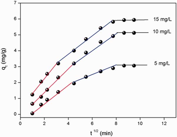 圖2:龍膽紫染料吸附到活性炭上的顆粒內(nèi)擴散模型。