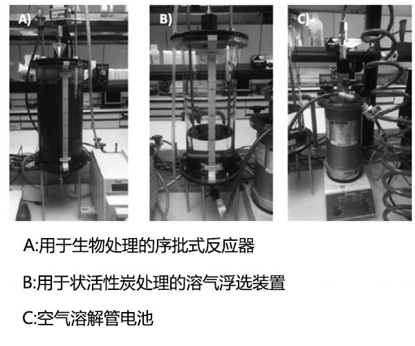 污水處理廠的活性污泥用于承載微生物,收集活性污泥并對其主要參數(shù)進行表征銨,硝酸鹽,亞硝酸鹽,磷酸鹽,化學需氧量,生物需氧量,總懸浮固體和pH每周一次,并儲存在4°C直至使用。將5L活性污泥泵入生物處理的序批式反應(yīng)器,混合并充氣2小時,然后使污泥靜置30分鐘。將1.7L上清液轉(zhuǎn)移至活性炭處理的溶氣浮選裝置單元,其中加入粉末狀活性炭并混合(30分鐘)。下一步包括加入凝結(jié)劑聚氯化鋁,12分鐘后加入絮凝劑。最后,將飽和水注入活性炭處理的溶氣浮選裝置裝置,開始分離步驟(12分鐘)。整個過程持續(xù)了大約四個小時。