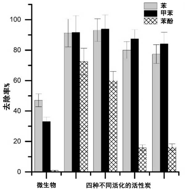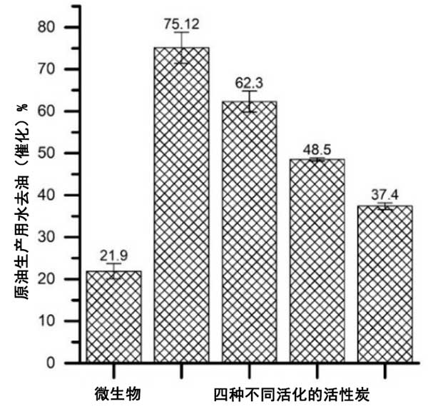 簡(jiǎn)而言之,使用活性炭(60%-93%)和載微生物活性炭(16%-84%)比游離的無活性炭載體的微生物(1%-47%)更好地去除芳香烴。材料的孔隙率和吸附偶極性有利于吸附。常規(guī)活性炭表現(xiàn)出高度的微孔性,其中可以容納分子量約為100的苯,甲苯和苯酚;钚蕴康姆菢O性特征保證了碳?xì)浠衔锏氖杷Γ彩欠菢O性的。活性炭陽(yáng)離子表面有利于芳烴保留,因?yàn)榉辑h(huán)中的π電子與表面陽(yáng)離子靜電連接。使用常規(guī)活性炭和載微生物活性炭的原油去除能力如圖3所示。使用游離的微生物和油-鹽水乳液作為對(duì)照。