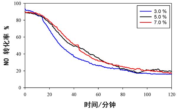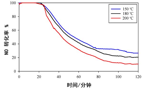 使用活性炭載錳氧化物催化劑時,不同溫度下NO轉(zhuǎn)化率數(shù)據(jù)與時間的關(guān)系如圖2所示。它用于提供可以與以前發(fā)布的數(shù)據(jù)進行比較的基線數(shù)據(jù)。在所有溫度(150°C,180°C和200°C)的前20分鐘內(nèi),幾乎有100%的NO轉(zhuǎn)化發(fā)生,但在此初始階段后NO轉(zhuǎn)化迅速下降,并且在2小時的測試后,轉(zhuǎn)化率不足20%;钚缘臏囟纫缽男砸来螢150°C>180°C>200°C。