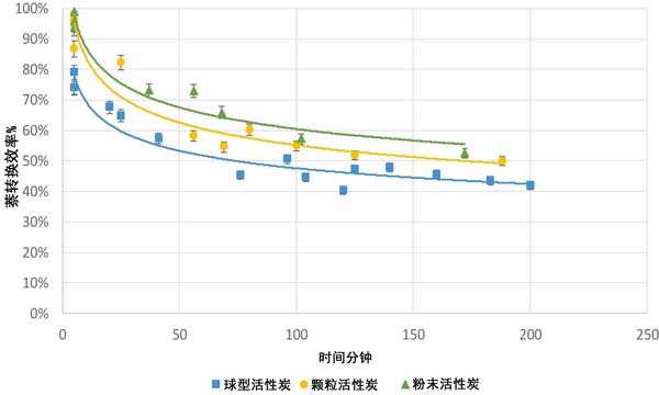 圖3:在750°C時(shí),活性炭球型、顆粒和粉末的萘轉(zhuǎn)化時(shí)間。