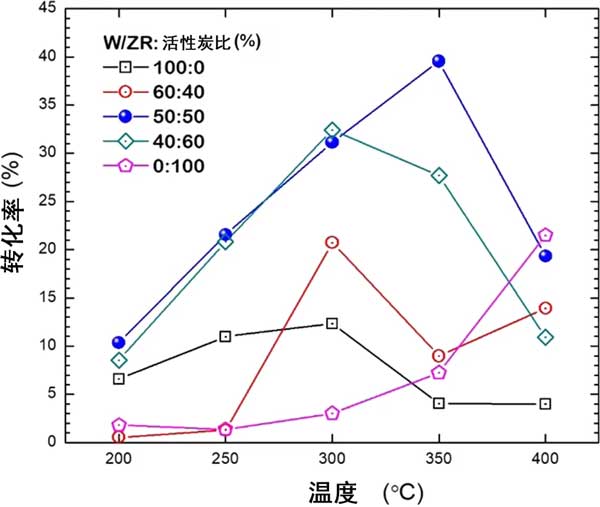 在第一部分中,我們比較了活性炭和氧化鋯單載體系統(tǒng)之間的性能;钚蕴繂屋d體顯示出高的重量比表面積,但仍低于合成為催化劑的活性炭。此外,其酸度高于氧化鋯的酸度,這被認為有利于酸催化的反應的活性。在圖1中,單載體催化劑的比較表明,在450-C的溫度下,W/ZR的轉化率高于W / 活性炭,而W / 活性炭在450°C時的轉化率比W/ZR高。W/ZR:活性炭的60:40和40:60在300°C時表現(xiàn)出最大的轉化率,分別約為21%和33%。我們發(fā)現(xiàn),最高的轉化率是由350:50的50:50 W/ZR:活性炭催化劑產(chǎn)生的。
