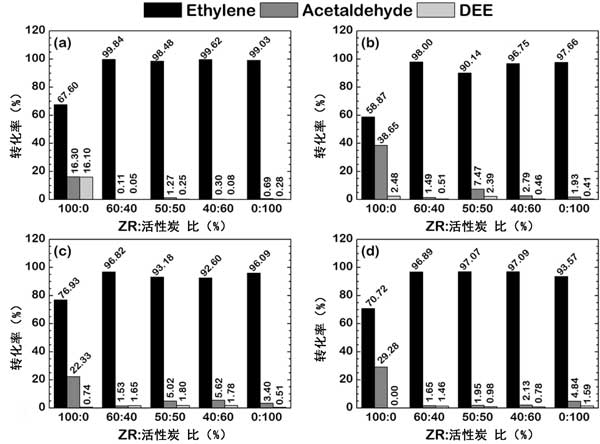 因此,提到在包含高達50wt%的活性炭的雙載體體系中發(fā)現(xiàn)的乙烯回收率的提高是由于來自活性炭的碳原子對催化劑的電子作用。另外,由于通過焦化的失活,大量的活性炭將導致乙烯回收率的降低,這是在高溫下與含碳反應物的反應中發(fā)現(xiàn)的常見的失活方案。這種失活導致活性位點的阻塞,降低了活性位點的數(shù)量,導致催化劑的總轉化率降低。