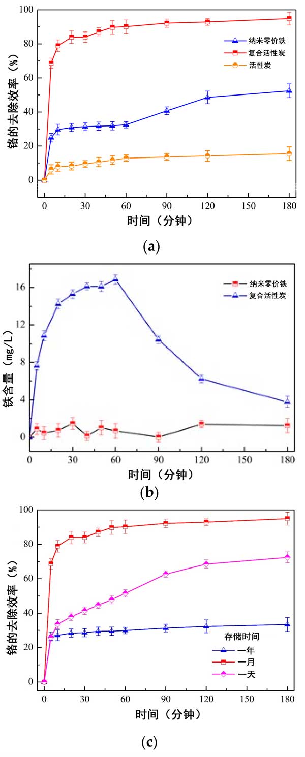 圖3:使用不同材料的總鉻的比較去除效率。(a)活性炭,nZVI和復(fù)合材料;(b)溶液中鐵含量的變化;(c)活性炭復(fù)合材料具有不同的存儲時(shí)間。