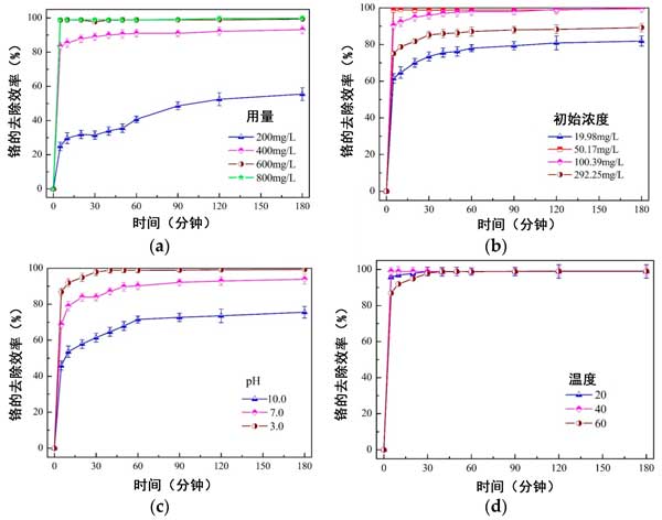 如在示出的圖4中的a,b中,活性炭中的nZVI劑量和初始濃度對總鉻的去除動力學(xué)顯著影響。初始去除率隨著活性炭復(fù)合材料劑量的增加或初始濃度的降低而逐漸增加,因?yàn)樘峁┝俗銐虻膎ZVI活性位與鉻反應(yīng)。