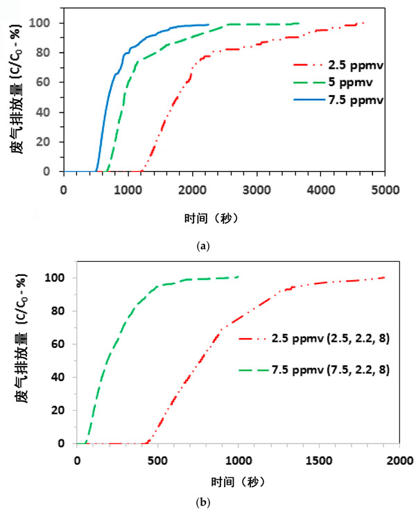 我們進行了一組實驗以評估進水氨濃度對其基于吸附的去除的影響。為此,使用6 cm和8 cm的活性炭色譜柱,在不同的進水氣態(tài)氨濃度下進行了幾次實驗。對于8 cm活性炭色譜柱,初始實驗在2.5至7.5 ppmv的氣態(tài)氨氣之間進行。分別在1.1和2.2 L/min的氣體流速下的各自發(fā)現(xiàn)顯示在圖2a,b中。顯然,隨著進水氨濃度的逐漸降低,突破點也向更長的時間轉移。例如,圖2中的結果a顯示以下突破趨勢:1295分鐘(2.5 ppmv)>712分鐘(5 ppmv)>532分鐘(7.5 ppmv)。此外,各個實驗的排氣時間值還顯示出在較低氣態(tài)氨濃度下的較長運行時間,即4000分鐘(2.5 ppmv)>2312分鐘(5 ppmv)>1574分鐘(7.5 ppmv)。此外,圖2中的吸附趨勢通常顯示出較寬的吸附穿透曲線,表明傳質(zhì)區(qū)(MTZ)的長度相對較大。這與苯在活性炭上的吸附有所不同,后者表現(xiàn)出明顯的穿透曲線。對于氨而言,這種不同的趨勢可能歸因于可以與表面酸性基團相互作用的氨部分的基本性質(zhì)。進入的氣態(tài)氨的增加及其從整體氣相到GAC表面的轉移將啟動GAC表面吸附位點(包括孔中的那些位點)更快的消耗。由于各自的表面吸附位點是固定的和有限的,因此預計在較高的進水氨濃度下,較早的突破以及較早的耗盡將逐漸發(fā)生。
