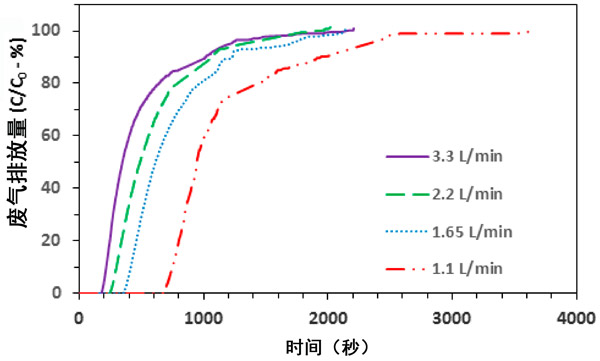 本研究還使用基于數(shù)據(jù)坑的活性炭研究了氣體流速對氨吸附的影響。圖3提供了1.1至3.3 L/min的氣體流速的相應結果。通常,氨氣流量的逐漸增加也會導致相應的穿透時間和排氣時間響應逐漸減少(圖3)。例如,流量為1.1、1.65、2.2和3.3 L/min時的突破時間分別為712、383、272和197 min(圖3)。因此,較高的突破時間值在較低的氨氣流速下蒸發(fā)。此外,對于1.1、1.65、2.2和3.3 L/min流量研究,還分別記錄了2312、1673、1315和1213分鐘的排氣時間。這類似于上述突破時間趨勢,可以解釋如下。在較低的流入氣體流速下,氨分子從氣相到活性炭表面的傳質(zhì)速率也相對較小。因此,與較高氣體流速下的活性炭表面部位相比,單位時間內(nèi)所占據(jù)的活性炭表面部位也更少,產(chǎn)生更高的穿透時間和耗竭時間響應(圖3)。這些發(fā)現(xiàn)對于實際應用尤其重要。