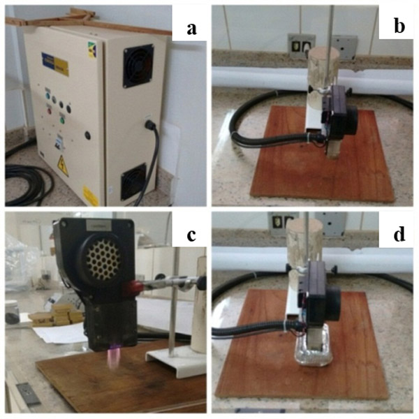 圖1:電擊設備(a)控制箱、(b)電擊頭、(c)排放頭、(d)表面處理布置。