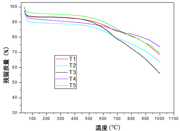 根據圖3,不同的處理導致熱分解曲線有所不同。此外,不同處理的殘留質量也有所不同,處理T1,T4和T5呈現(xiàn)更高的殘留質量,表明這些處理具有更高的耐熱性。處理T2和T3的殘留量較低,表明處理的耐熱性較低。此外,這些處理在后期殘留質量之間存在重大差異而脫穎而出。根據處理(電擊時間),降解曲線的差異可能與表面上不同官能團的存在有關。在熱過程中,由于存在的官能團,會形成不同的產物,從而導致更高或更低的質量損失,因為活性炭的熱分解反應了其表面上官能團的存在。然后,官能團的類型和數量都會影響熱重曲線。但是,由于表面官能團的降解與其結構不同,因此官能團的類型具有更大的影響,并且可以解釋處理之間的差異。