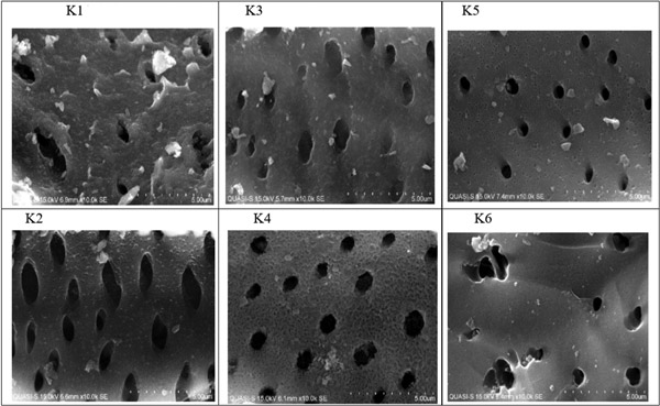 對原始活性炭(圖3中的K1)的掃描顯示出相當(dāng)均勻的孔;钚蕴康慕Y(jié)構(gòu)可以看作是薄片,為不規(guī)則分布和各種尺寸的孔提供了較大的吸附面積。表面上的大多數(shù)可見孔都在5微米范圍內(nèi),這與對椰殼活性炭的預(yù)期一致,而在這5微米孔內(nèi)可以看到小于1微米的較小孔。圖3中的K2顯示了在氯酸鹽吸附到表面活性部位后活性炭表面的變化。這些孔有變化的跡象,因為其中一些吸附氯酸鹽,而其他孔被氯酸鹽和氯化物分子阻塞。在10,000倍的放大倍率下,可以觀察到小孔周圍和大孔入口處的沉積,因為預(yù)計表面活性基團會大量存在于這些區(qū)域;钚蕴康乃嵝栽偕鷺O有可能形成了表面活性部位,從而增強了活性炭吸附大量氯酸鹽的能力。