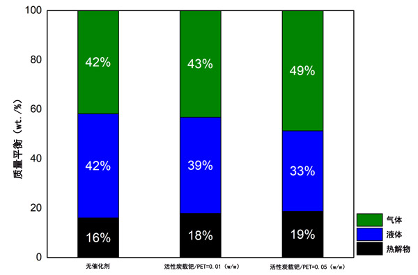 圖3:比較在800°C下有活性炭載鈀催化劑和沒有催化劑的情況下PET熱解的質(zhì)量平衡。