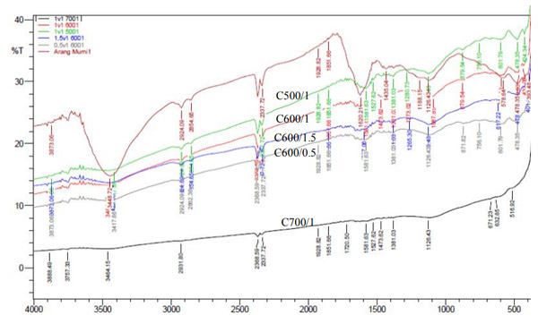 對(duì)于峰的強(qiáng)度,活化溫度在降低強(qiáng)度中起重要作用。較高的溫度將產(chǎn)生具有較少官能團(tuán)的活性炭。最高活化溫度樣品顯示幾乎平坦的光譜。同時(shí),對(duì)于活化劑定量,效果很小。比率從0.5增加到1.5似乎對(duì)樣品的化學(xué)性質(zhì)沒(méi)有任何影響,因?yàn)槿齻(gè)光譜相似。