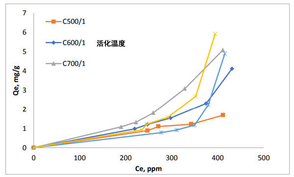 圖3顯示了鈣離子的吸附等溫線。等溫線表示分類的I型或II型。較低溶液濃度下的小肩部可能暗示了鈣離子微孔填充的單層吸附飽和。這表明孔表面與鈣離子之間的相互作用較強(qiáng);钚蕴康牡涂紫抖热员硎綢II型等溫線,因?yàn)闆](méi)有明顯的微孔可以被鈣離子填充,而不是外表面和大孔。