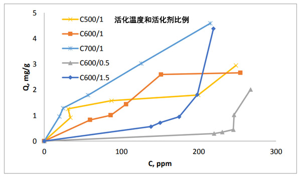 從圖2中可以看出,活性炭在不同的活化溫度(500℃,600℃和700℃)和活化劑比率(0.5、1.0和1.5)下的鋰吸附等溫線。似乎在較低濃度下吸附能力相對(duì)較低。這表明鋰離子對(duì)活性炭表面的親和力低。高濃度下容量的增加與孔隙率成正相關(guān);钚蕴康妮^大表面積傾向于更多地吸附鋰離子。在等溫線的分類中,該等溫線被認(rèn)為是III型等溫線,對(duì)于無(wú)孔或大孔吸附劑來(lái)說(shuō)是典型的。因此,鋰離子似乎不附著在微孔內(nèi)部,而是附著在外部和大孔表面。活性炭對(duì)鋰離子的親和力低。炭表面的碳原子與溶液中的鋰離子之間的低相互作用可能是由于離子的原子質(zhì)量低所致。原子間勢(shì)相互作用表明該力與相互作用原子的原子質(zhì)量以及原子之間的距離具有正相關(guān)。
