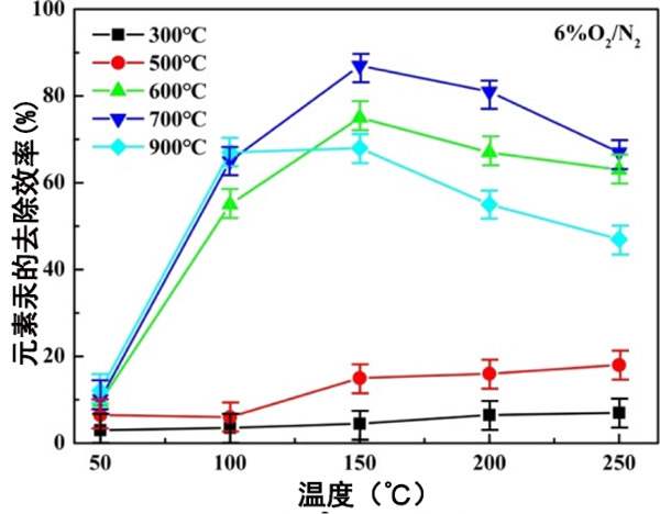 對(duì)于活性炭吸附煙氣中的元素汞。除汞測(cè)試表明,熱解溫度為700°C時(shí),活性炭的除汞效率為86%。氧氣的存在促進(jìn)了元素汞的去除。當(dāng)熱解溫度升至900°C時(shí),活性炭趨于團(tuán)聚,導(dǎo)致結(jié)晶相粒徑急劇增加,從而抑制了元素汞的去除。但在更高的熱解溫度下會(huì)增加。活性炭的BET表面非常差,當(dāng)熱解溫度不高于500°C時(shí),幾乎不會(huì)產(chǎn)生鈷元素,導(dǎo)致除汞效率低。無(wú)論如何,活性炭可以用于吸附去除元素汞,而不是通過(guò)化學(xué)改性添加鈷,從而可以在燃煤煙氣中去除汞。