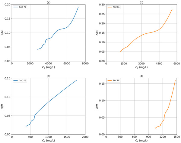 圖1顯示了顆粒活性炭與原浸出液,粉狀活性炭與原浸出液,粉狀活性炭與廢液以及粉狀活性炭與廢液的實(shí)驗(yàn)等溫線。兩個(gè)樣品的曲線和兩個(gè)活性炭對(duì)應(yīng)于S形的等溫線(II型)的行為,因?yàn)榍是凹向上,所以多層吸附進(jìn)行活性炭的表面上。利用該信息,就滲濾液而言,不管活性炭顆粒的性質(zhì)和大小如何,都可以假定吸附劑中殘留的化學(xué)需氧量是通過(guò)物理吸附發(fā)生的。
