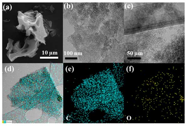 圖1:活性炭的SEM圖像(a),TEM圖像(b,c),孔隙數據(d)和元素映射(e,f)。