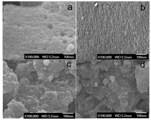首先是電子顯微鏡,圖1顯示了活性炭(a),高溫活化后的活性炭(b),鎢浸漬活性炭(c)和鎢浸漬活性炭載鉑催化劑(d)的形態(tài)。SEM圖像(圖1a)顯示了在CO 2氣氛下在800℃下氣化的固體炭的形態(tài)。其多孔表面是由高溫下的CO 2蝕刻過程所貢獻的。高溫活化后的活性炭變得高度多孔,在1000°C碳化后,炭中形成了更多的孔和通道(圖2b)。鎢浸漬活性炭樣品中原始的活性炭結(jié)構(gòu)似乎消失了(圖1c),因為在高溫下活性炭和氧化鎢之間的碳熱還原反應(yīng)破壞了活性炭結(jié)構(gòu);钚蕴康谋诒砻媲度肓酥睆皆3到10 nm之間的納米粒子(圖1c),根據(jù)XRD結(jié)果,這意味著這些納米粒子應(yīng)為碳化鎢結(jié)構(gòu)。在鎢浸漬活性炭樣品中加入1.0%鉑后,表面形態(tài)無明顯變化(圖1d)。