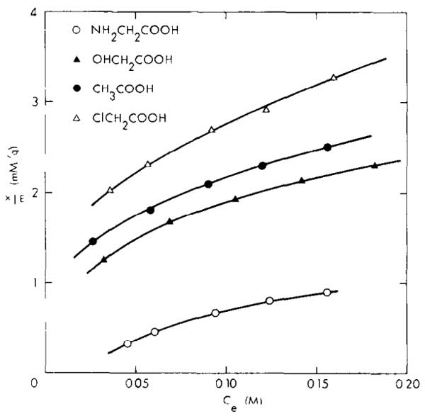 等溫線的比較表明,吸附通常以CICH,COOH>CHsCOOH>OHCH,COOH>NH,CHsCOOH的順序降低。圖1通過取代乙酸在碳原子上的吸附等溫線顯示了這一點。