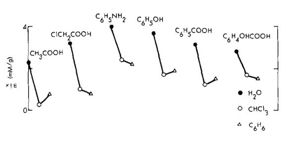 通過測量水,氯仿和苯中溶液對乙酸,一氯乙酸,苯甲酸,苯酚,苯胺和水楊酸的吸附,研究了溶劑極性的影響;钚蕴康慕Y(jié)果如圖2所示。-Cl在乙酸分子中的吸附總是增加,但是在有取代苯的情況下,吸附順序是