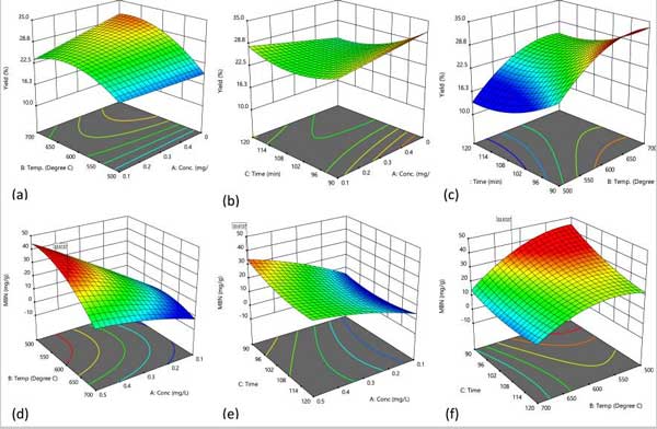 圖1:3-D圖顯示了(a、d)溫度和濃度(b、e)接觸時間以及濃度(c、f)接觸時間和溫度的相互作用對活性炭的百分收率和亞甲基藍數(shù)的影響。
